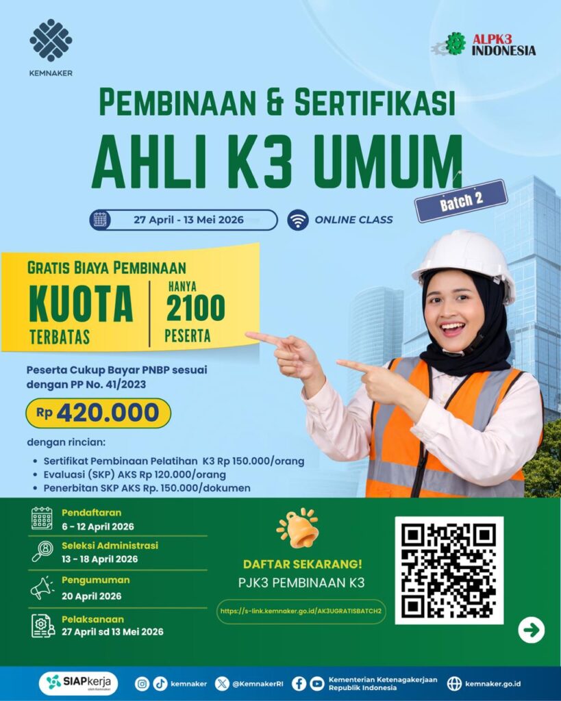 Jakarta — Setelah sukses menyelenggarakan batch I, Kementerian Ketenagakerjaan (Kemnaker) kembali membuka program Pembinaan dan Sertifikasi Ahli Keselamatan dan Kesehatan Kerja (K3) Umum Batch 2 dengan kuota 2.100 peserta dari seluruh Indonesia. Pendaftaran dibuka pada 6–12 April 2026.